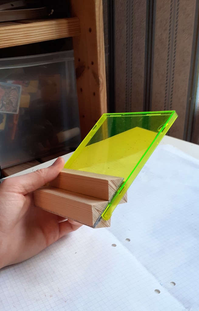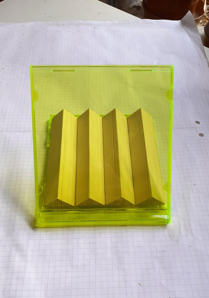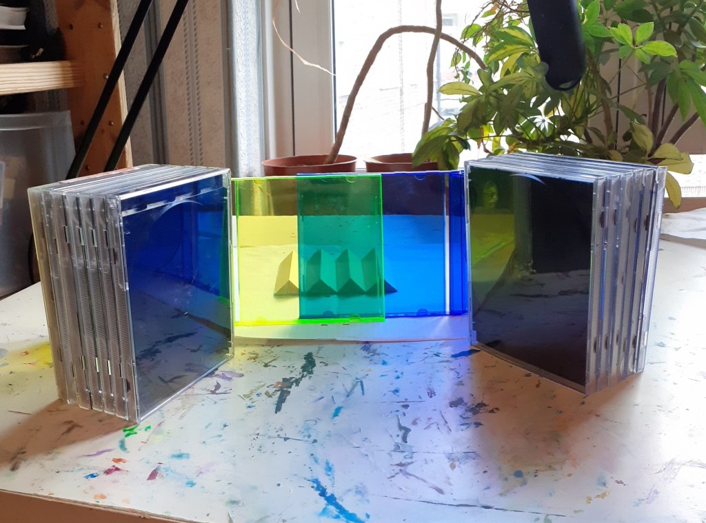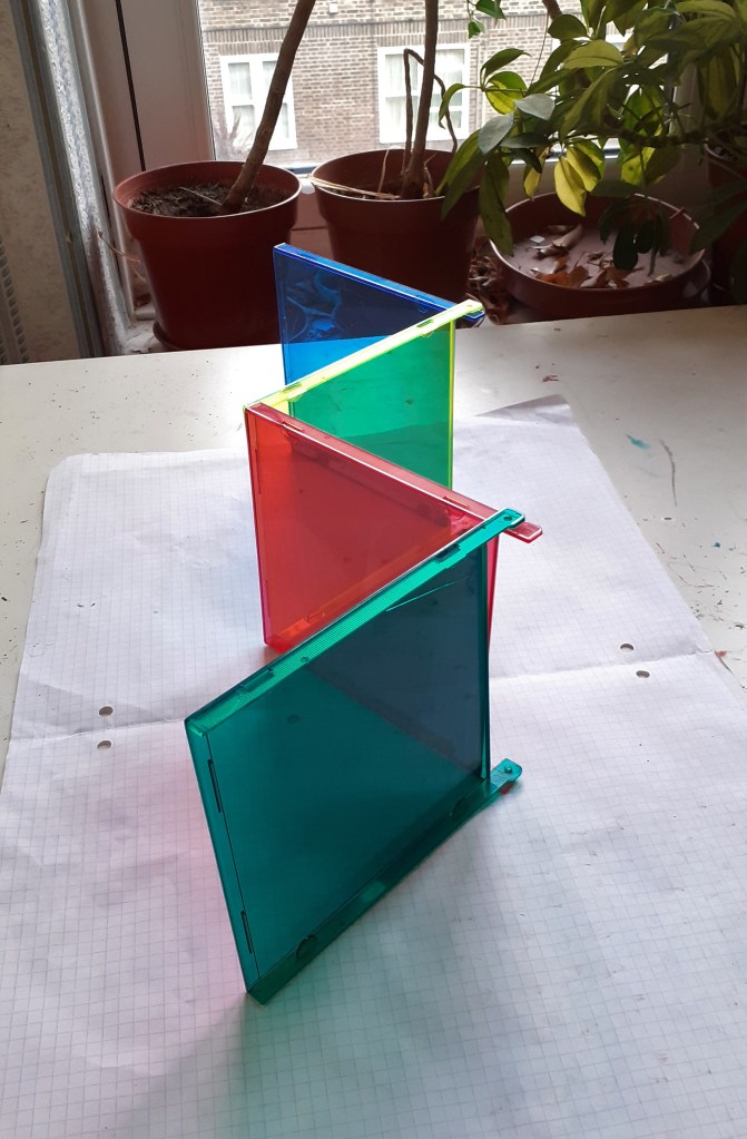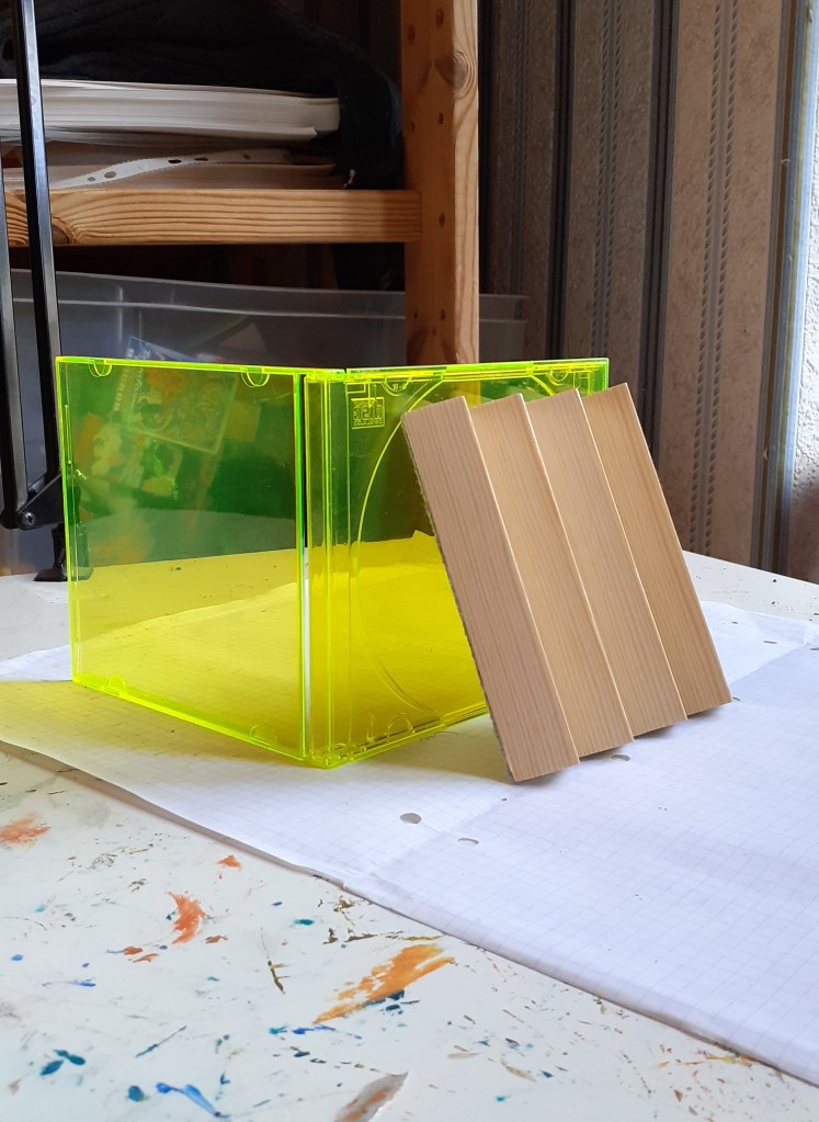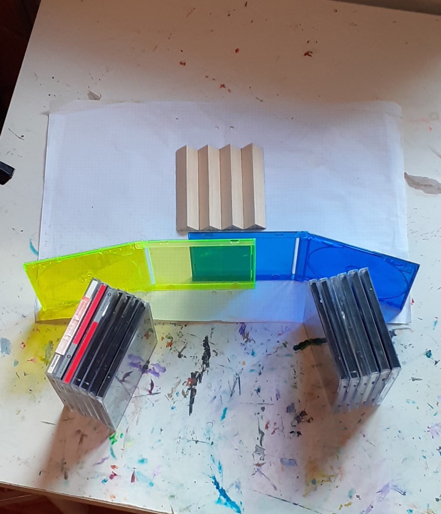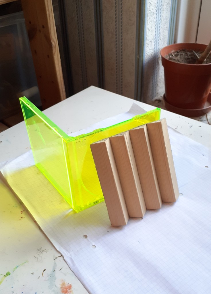 While charity shopping during summer I found what I later learned to be a pan resting device. The piece of wood attached to felt allowed for a number of arrangements which I found very exciting. I filmed myself playing with it and also experimented arranging it with coloured acrylic cd cases which I also found.