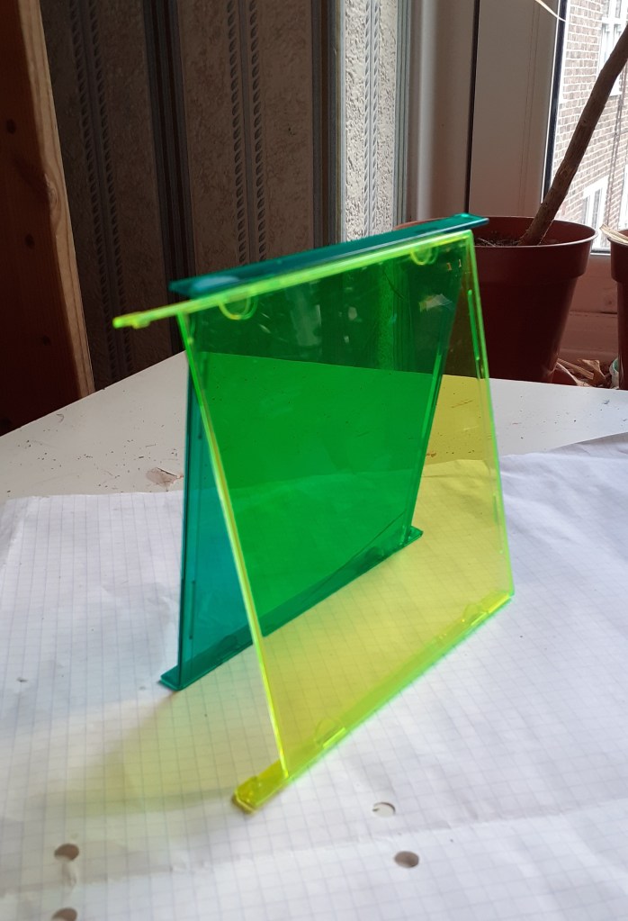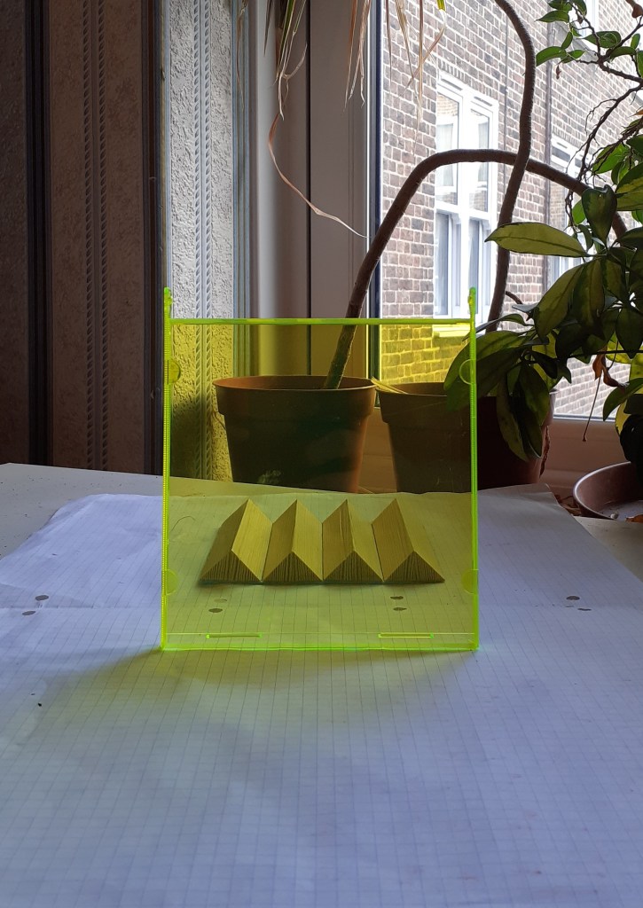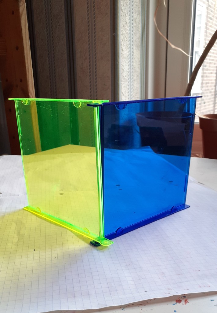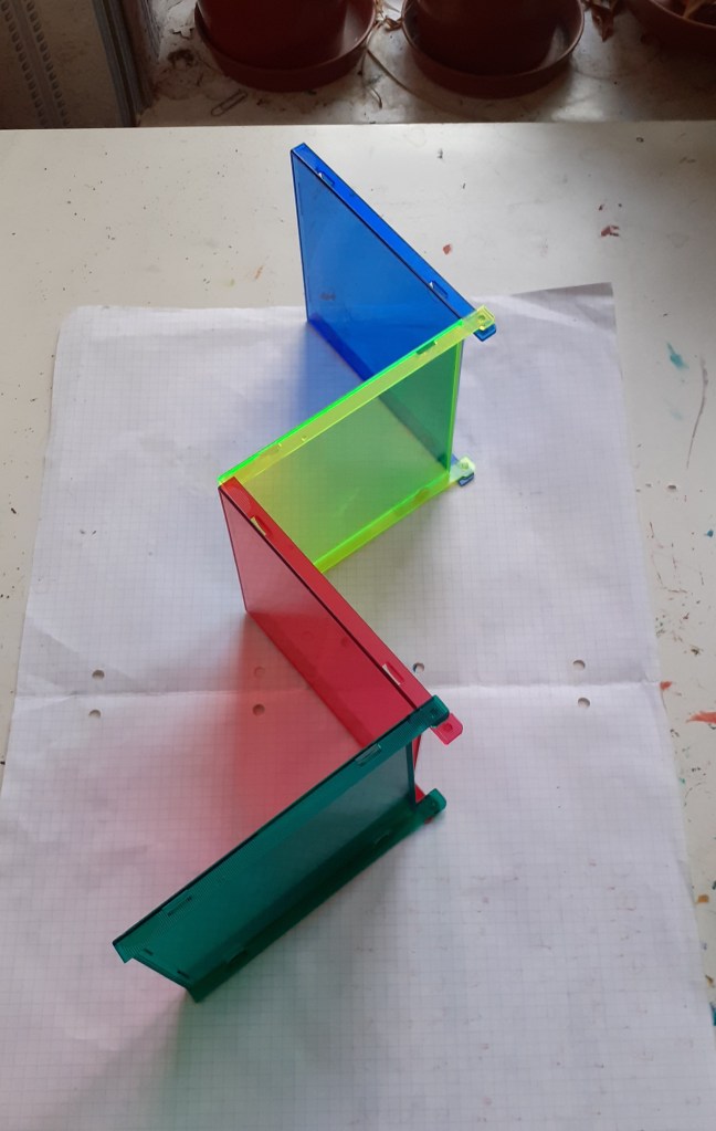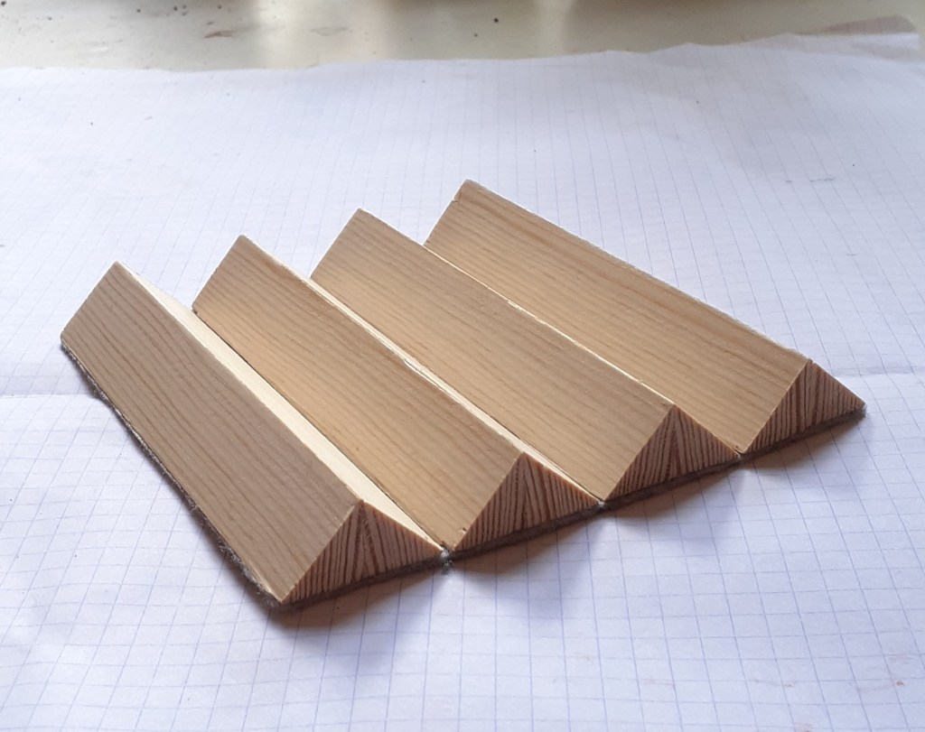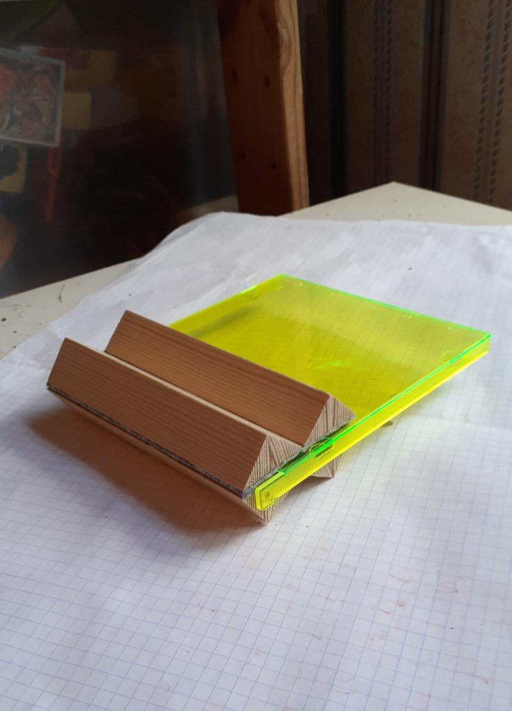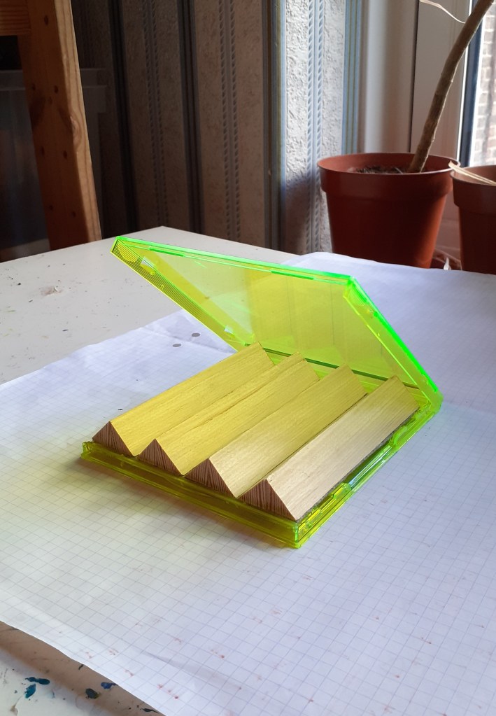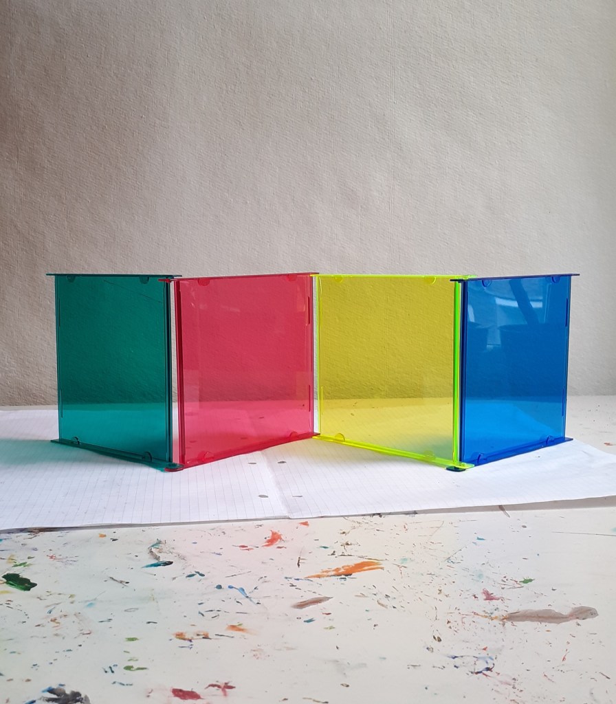 While charity shopping during summer I found what I later learned to be a pan resting device. The piece of wood attached to felt allowed for a number of arrangements which I found very exciting. I filmed myself playing with it and also experimented arranging it with coloured acrylic cd cases which I also found.