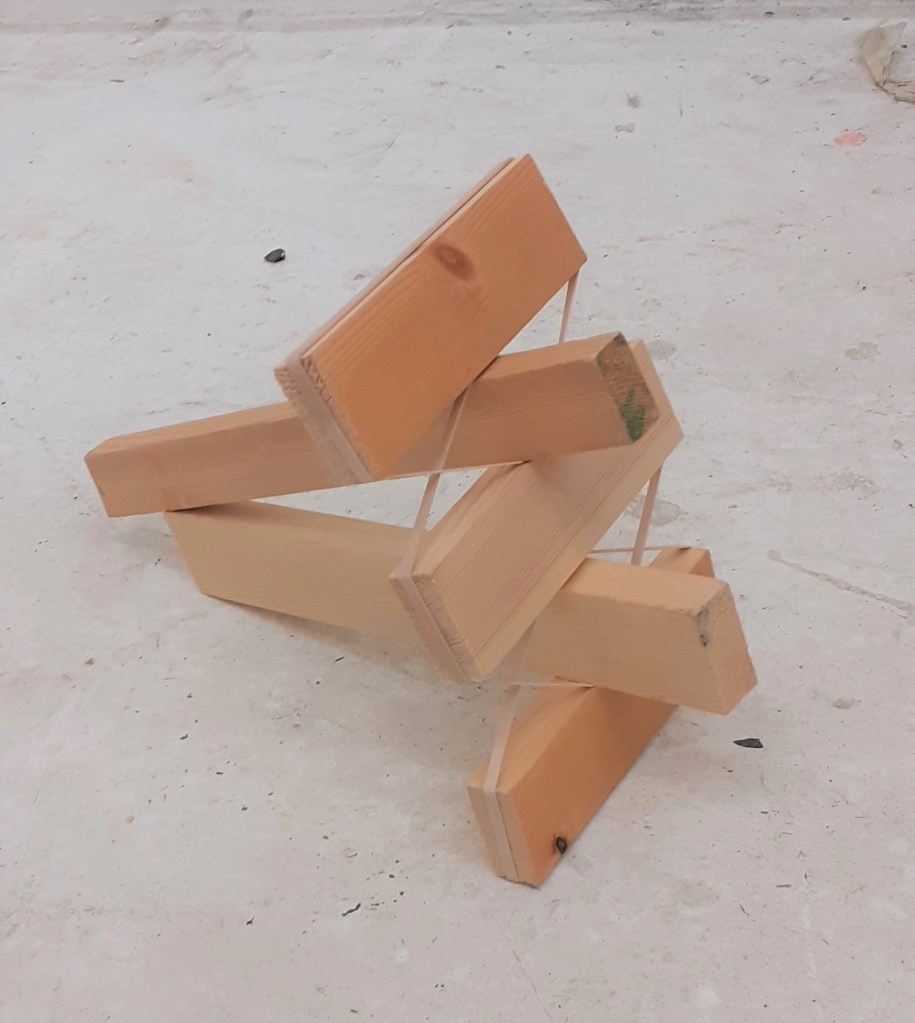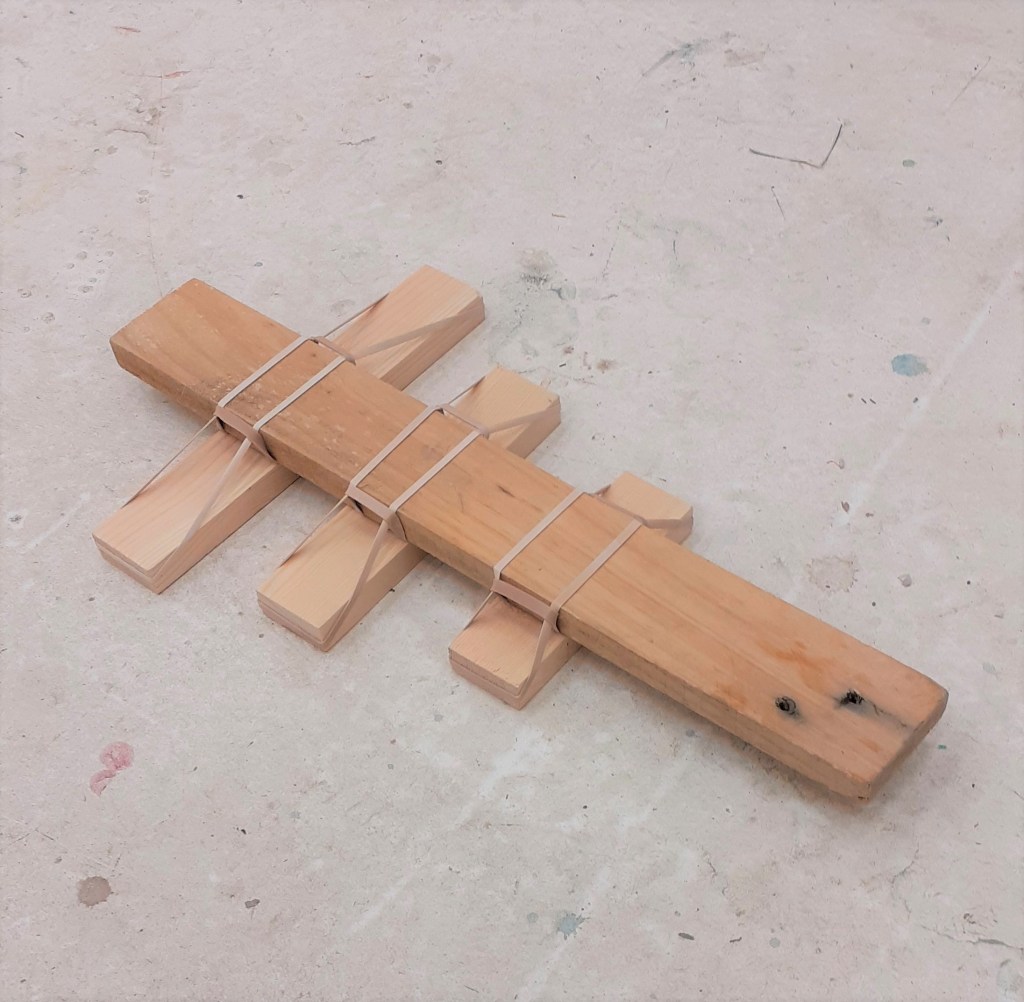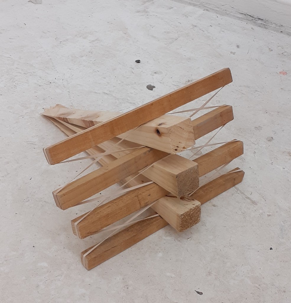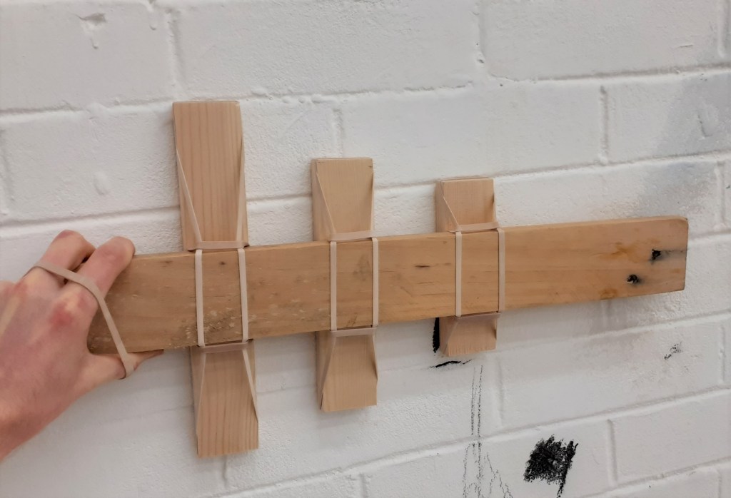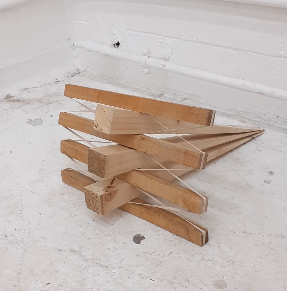 Developing on from the stone and elastic works I made at home, this week I have experimented using rubber bands with the materials within my studio, largely wood. There is something interesting about the precariousness of some of these structures, along with how this is perceived by a viewer.