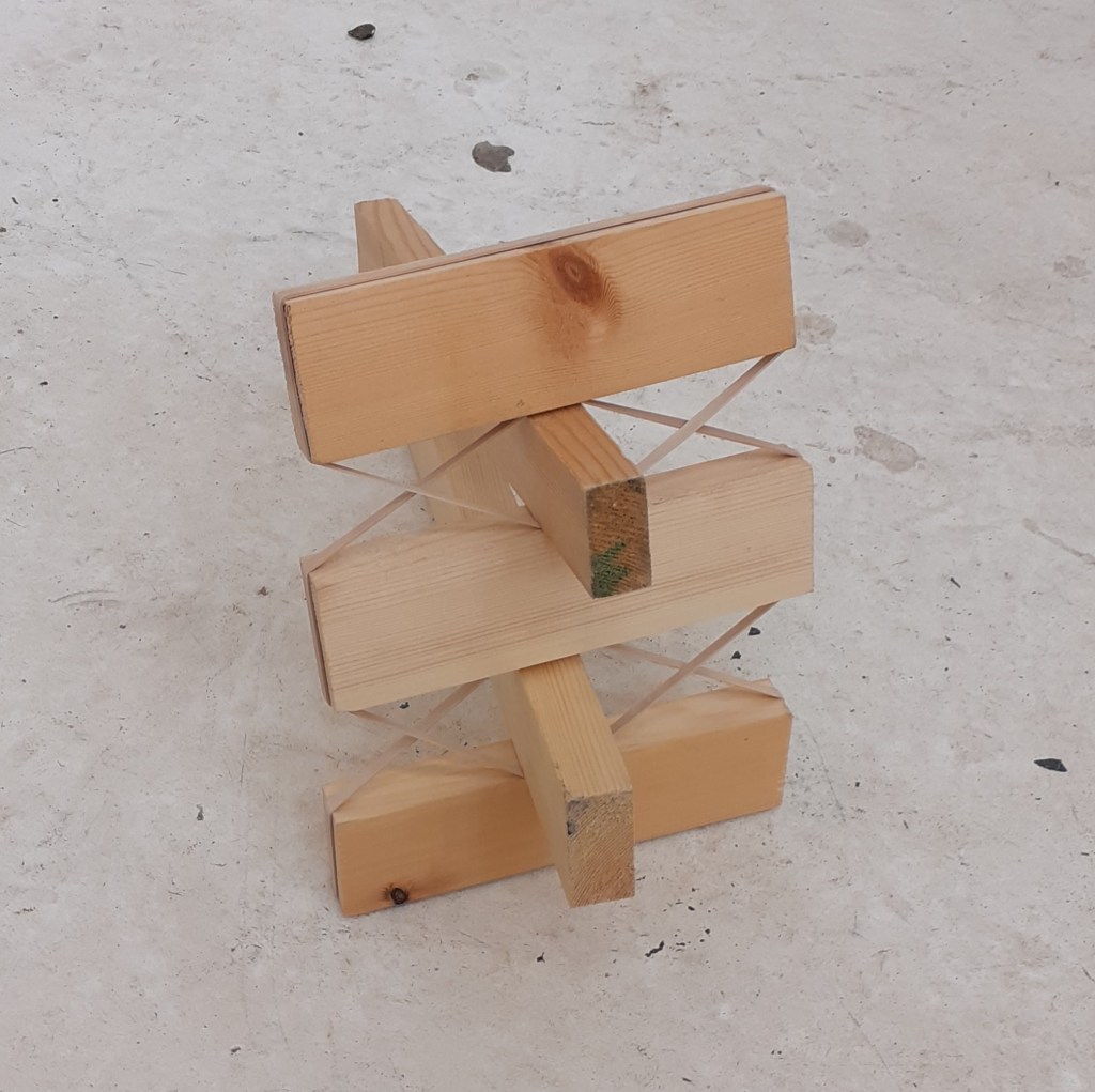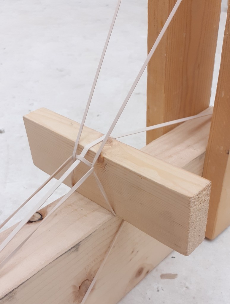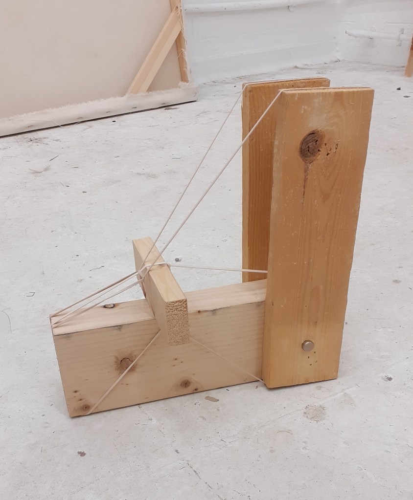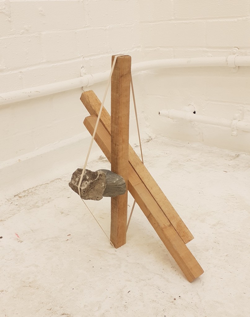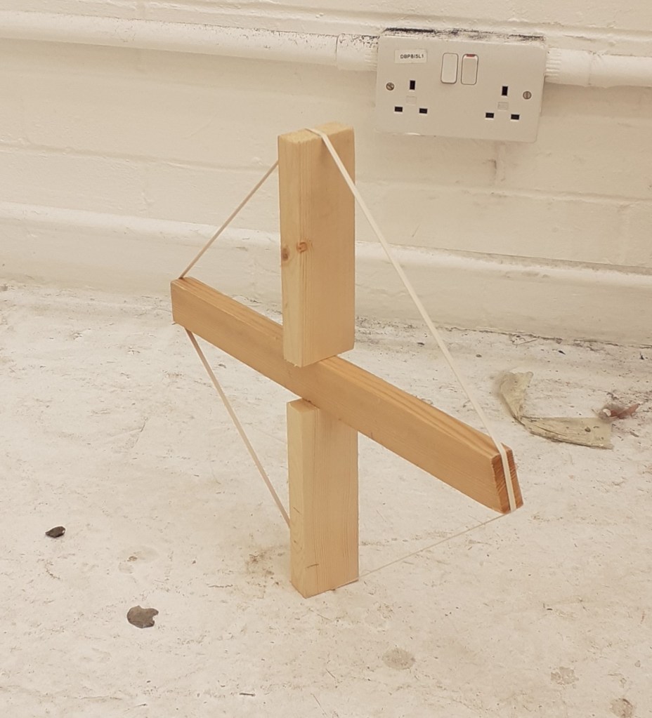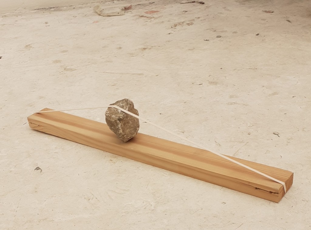 Developing on from the stone and elastic works I made at home, this week I have experimented using rubber bands with the materials within my studio, largely wood. There is something interesting about the precariousness of some of these structures, along with how this is perceived by a viewer.