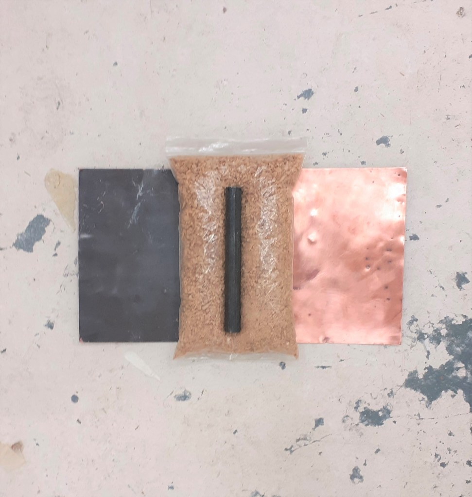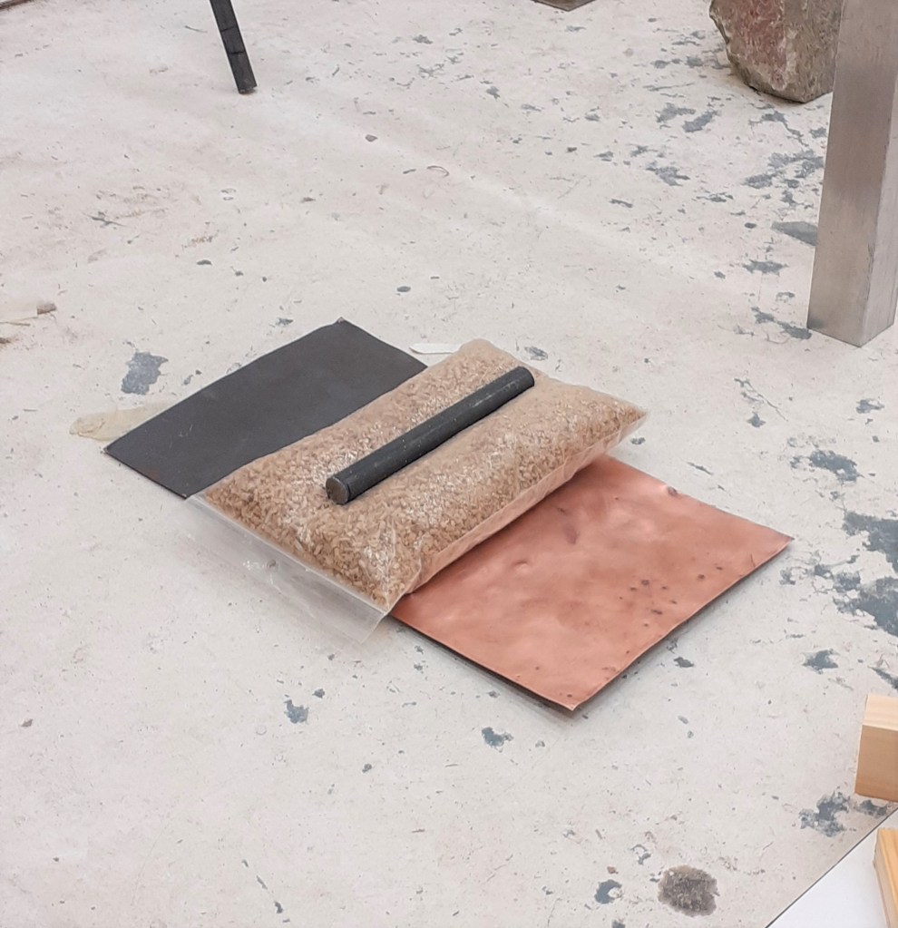 One of the things I took from Steve was a sheet of Copper. It had a layer of black coating over it all which I sanded down for half the sheet (it took a while). I was also extremely flexible.