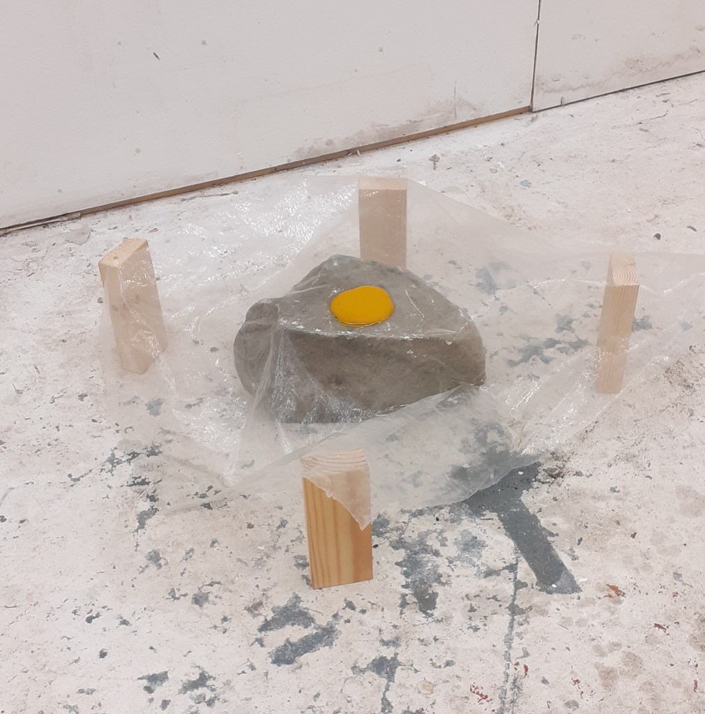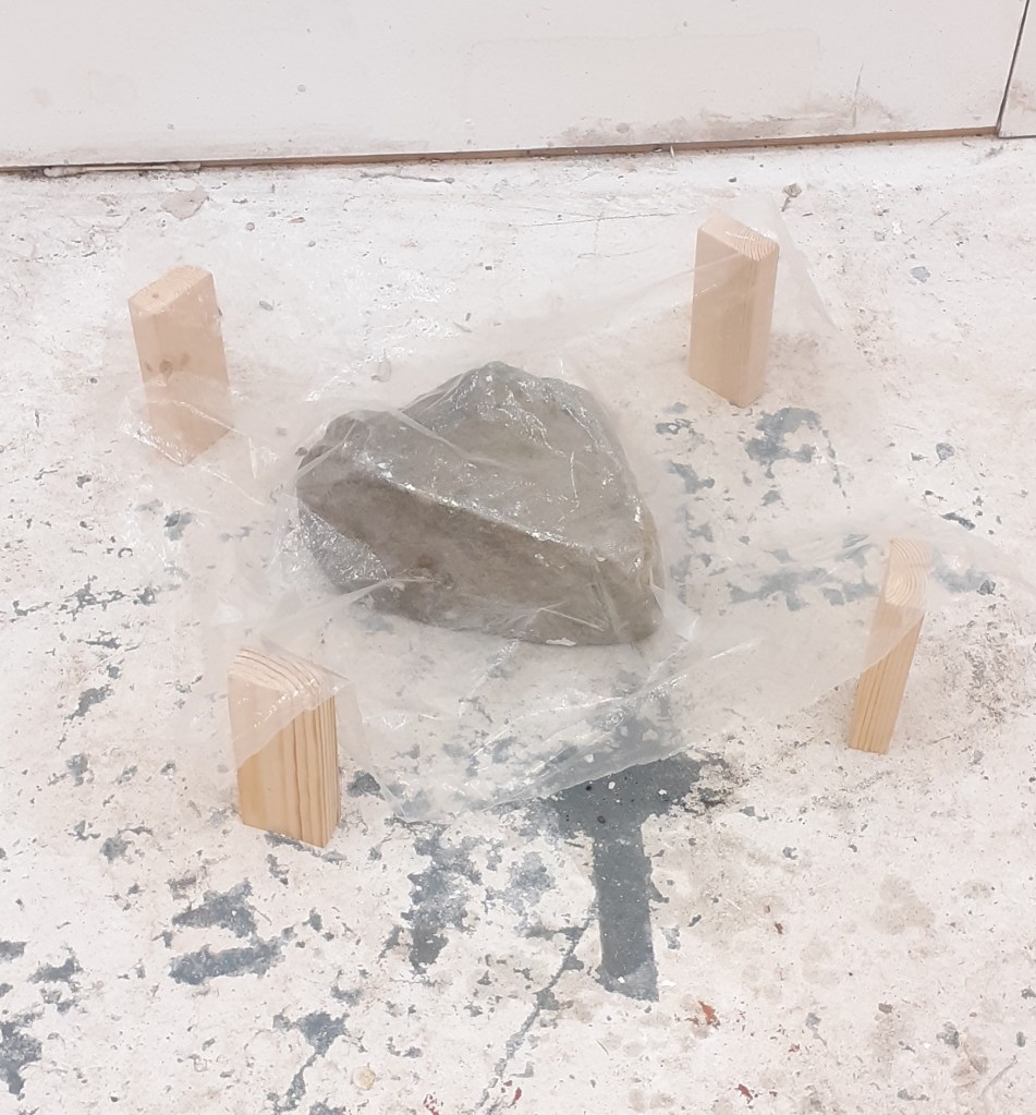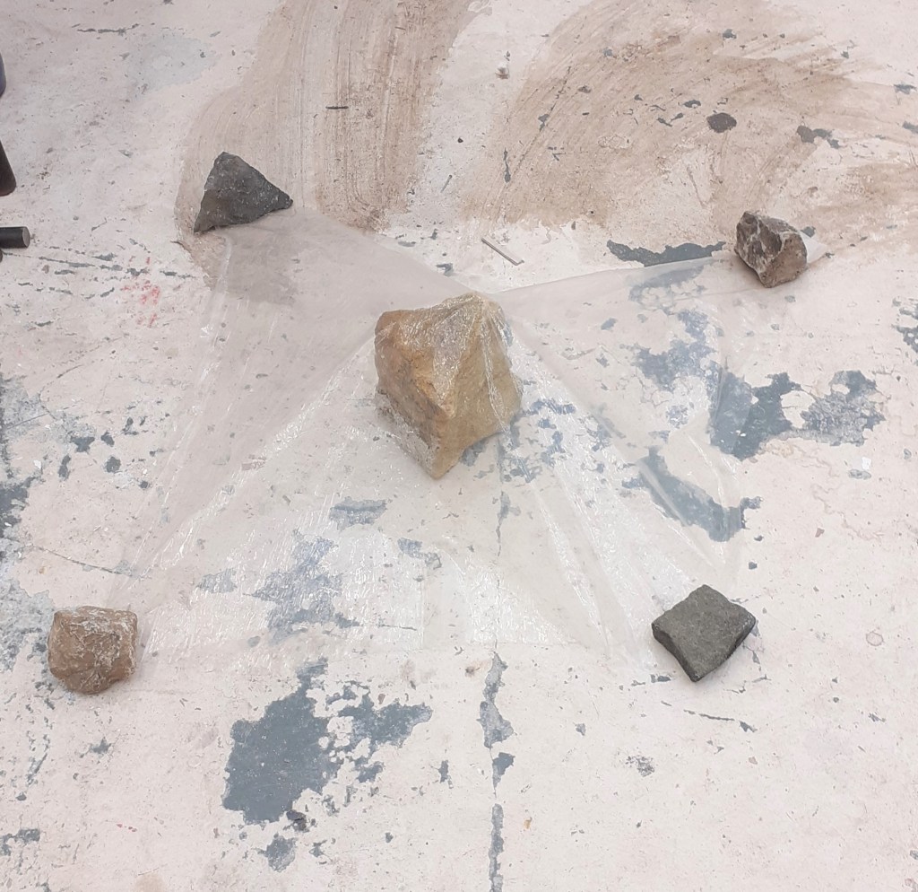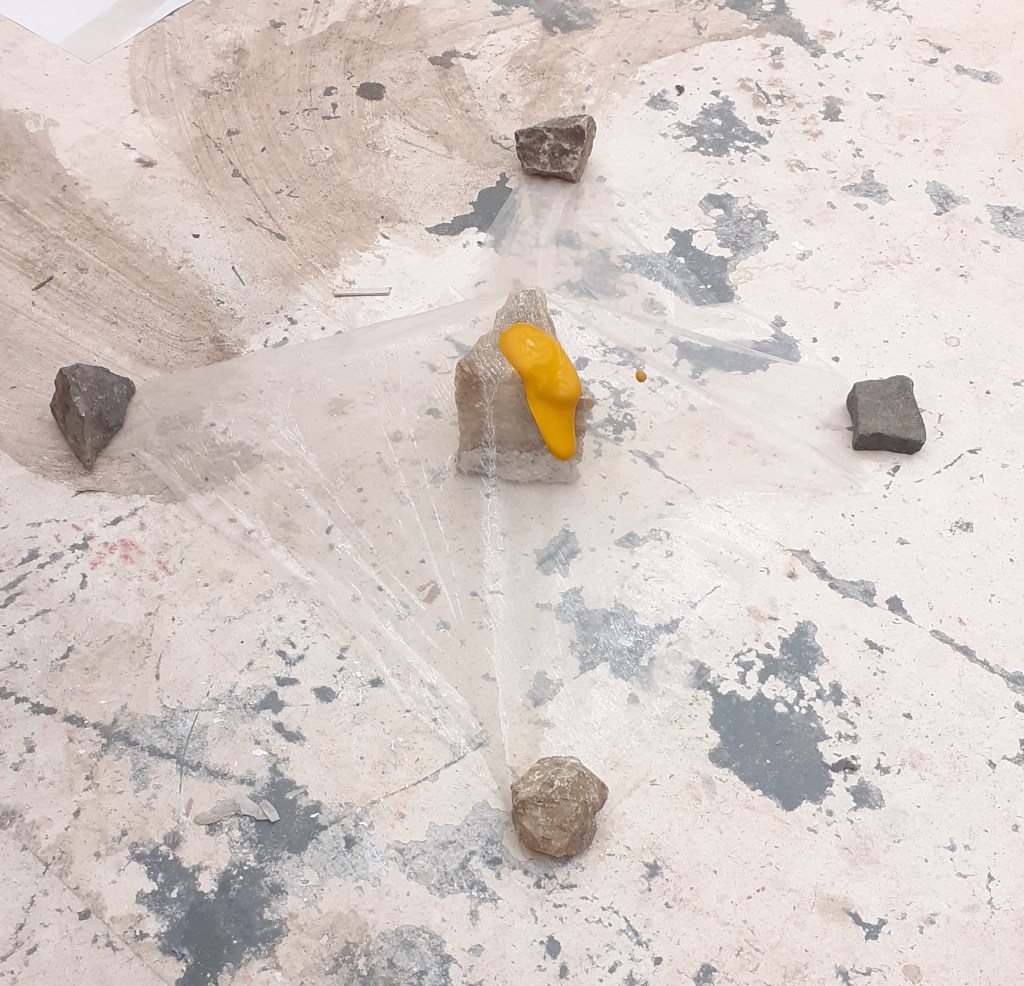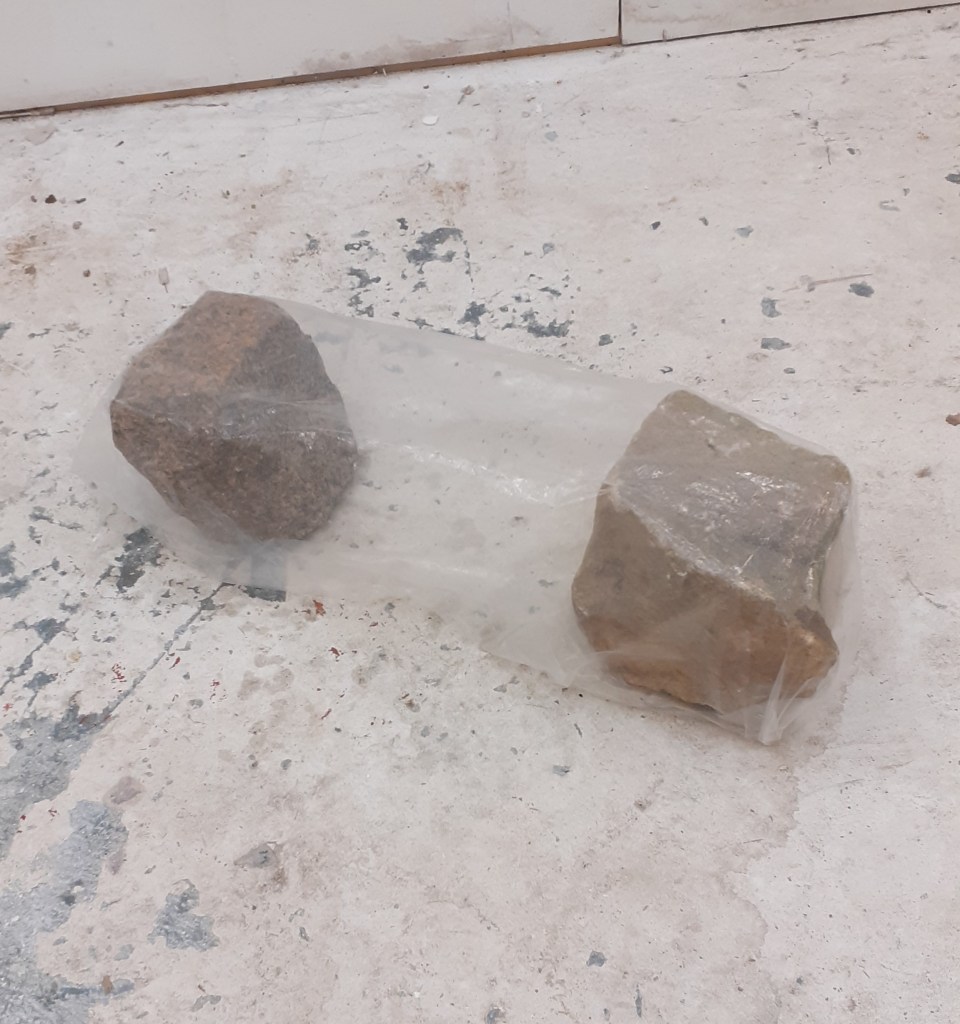 In the fleeting last few days before leaving Newcastle I began to use transparent plastic sheets. Placing them over rocks I found I could pour things over them without getting the rocks beneath them wet. I enjoyed the kind of tension/ strangeness this created.