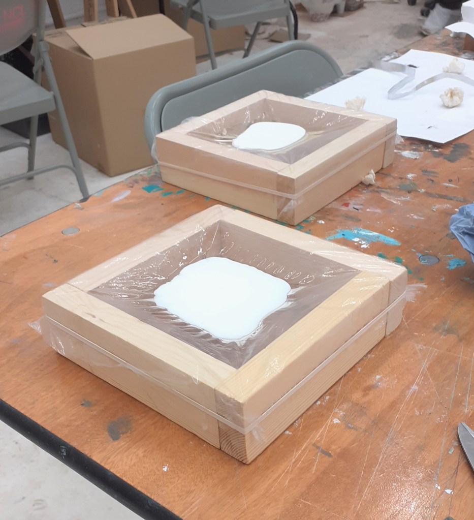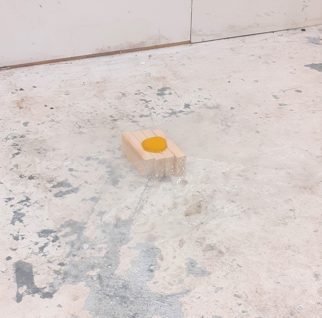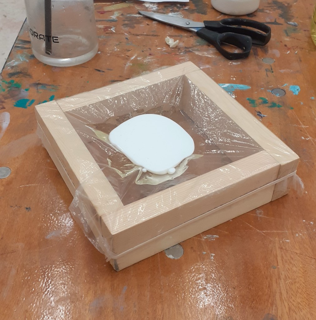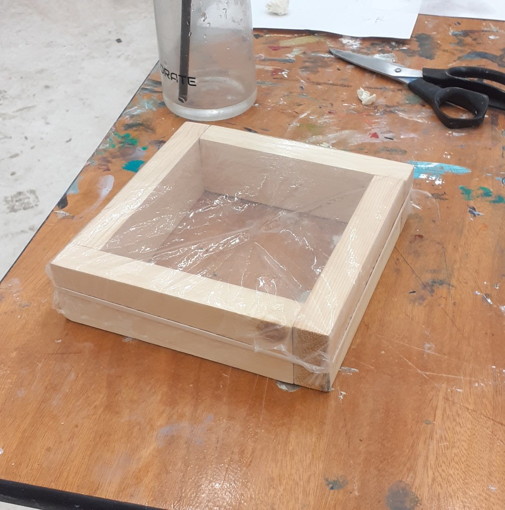 The VERYYY last thing I did before fleeing the Newcastle Fine art building was to to create a small experiment. I fixed a piece of the plastic around a wooden frame then poured first vegetable oil then acrylic paint into it. I repeated this with another frame only this time using gesso. Hopefully if I ever get to return to my studio I will be able to see the result of this experiment.