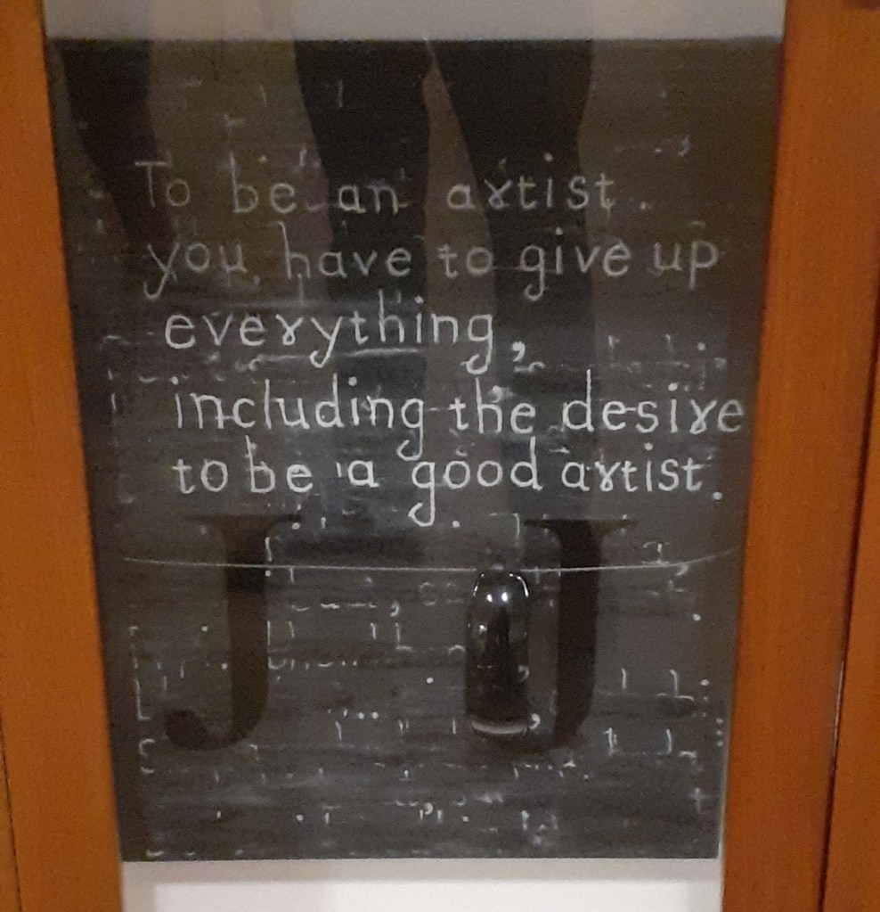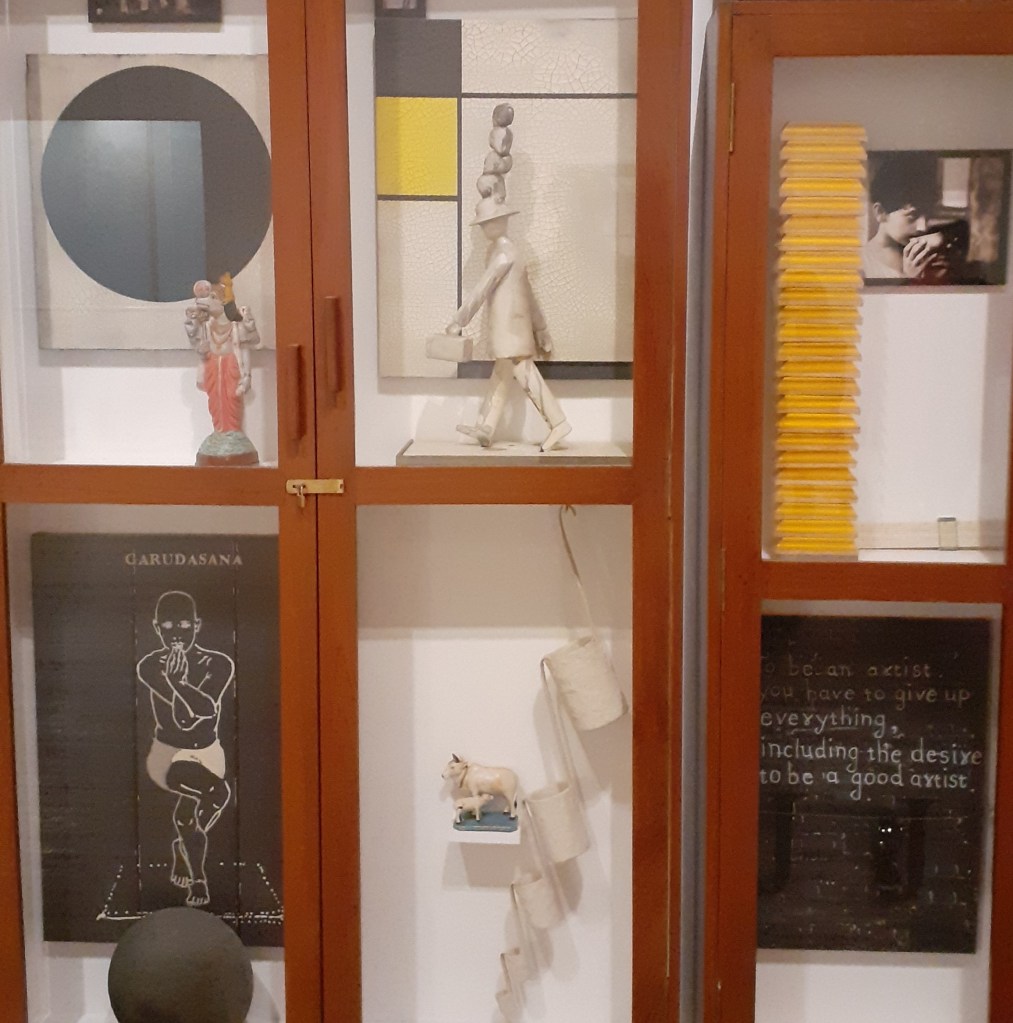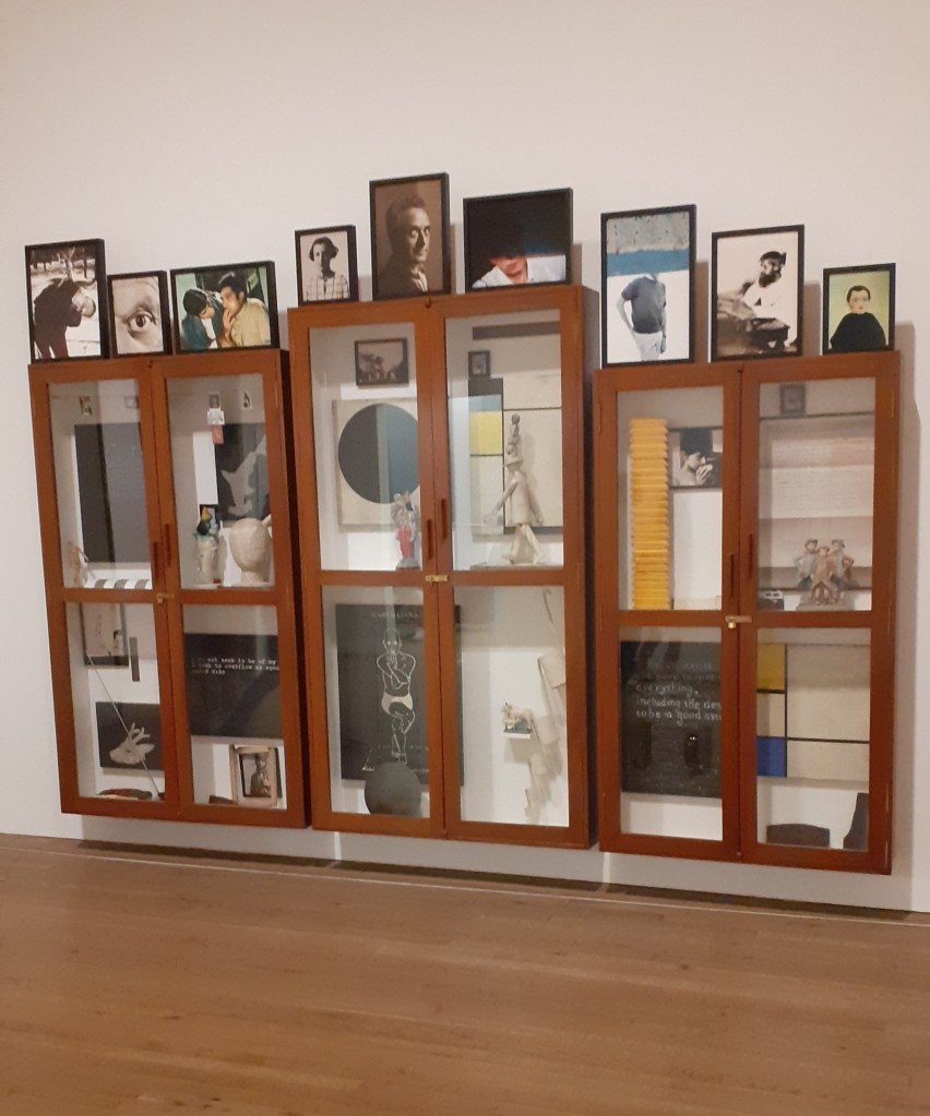 Atul Dodiya. Meditation (with open eyes) (2011) – assemblage of inspiration for the artist. Includes cracked Mondrians, photos of artists such as Rauschenberg and Beuys, quotes and other smaller objects and figurines. There was just something very exciting about the arrangement when I first saw it, in terms of the display format and the use of other artists work within the piece. The work is very much an artist’s artwork though.