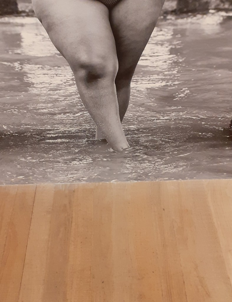 I was interested in the curatorial decision in the Zaneli Maholi for certain photographs to be enlarged and printed as if they were on/ part of the wall. The figures were life-size if not larger and the photos were arranged so that the bottom of them was flush with the gallery floor. I became quite interested in where the photos met the floor and how this altered the space slightly. This was particularly the case for this photo where the addition of water seemed to do sometime special with the wooden floor.
